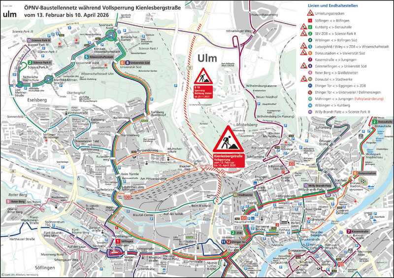 Von Freitag, 13. Februar bis Freitag, 10. April 2026 ist die Kienlesbergstraße in Ulm durch den Abbruch der Wallstraßenbrücke vollgesperrt. Dadurch kommt es im Stadtverkehr Ulm sowie im regionalen Bus- und Eisenbahnverkehr zu Umleitungen und Fahrplanänderungen.